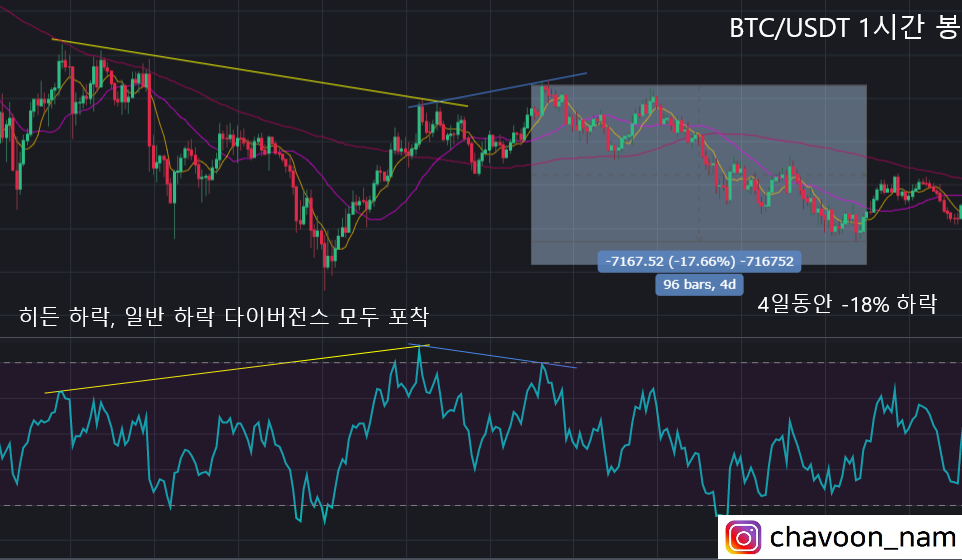 일반 상승 다이버전스, 히든 하락 다이버전스가 동시에 포착되었을때, 매수(롱) 보다 매도(숏) 포지션이 더 유리함